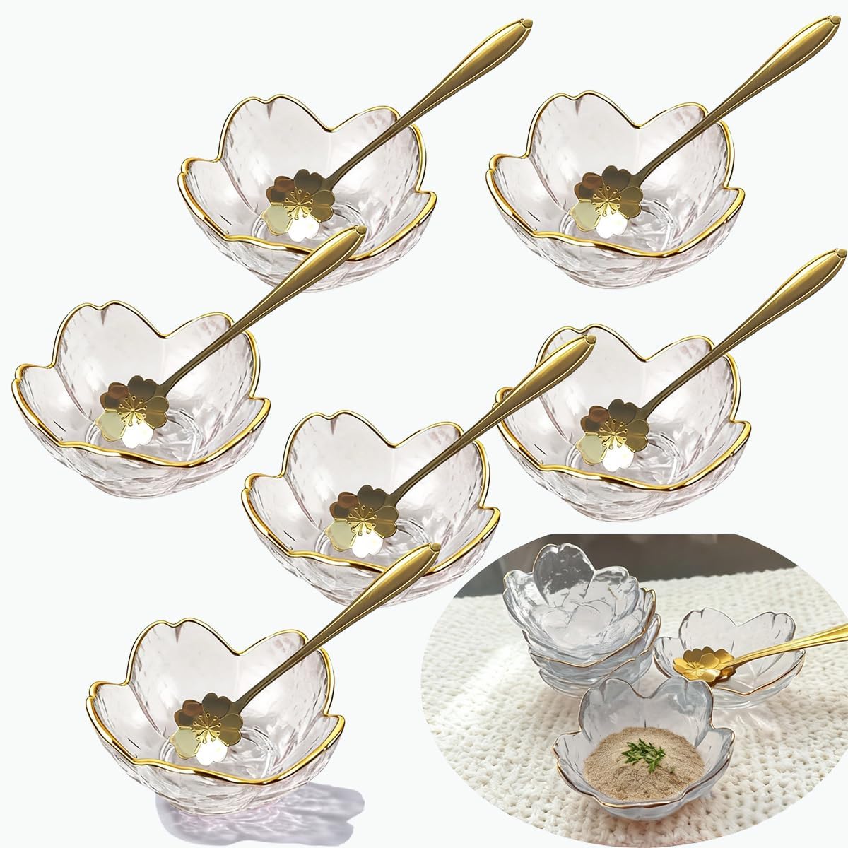 12-Piece Sakura Dipping Bowls with Gold Trim - 3.34"Pink Crystal Glass Cherry Blossom Sauce Dishes with Metal Spoons for Sushi, Appetizers & Party Serving Product Features: - Premium Materials: made of ECO-friendly lead-free glass,environmental protectional than most other materialc, long-lasting use for indoor or outdoor dining. - Charming Cherry Blossom Look: Vibrant pink sakura design adds elegance to meals, perfect for birthdays or holiday gatherings. - Versatile & Stackable: Great for sauces, desserts, or jewelry; stackable to save space in any kitchen or dining setup. Product Specifications - Total Pieces: 12 - Components: 12 Crystal Glass Cherry Blossom Sauce Dishes with 12 Metal Spoons - Dimensions: 3.34" diameter x 1.37" height - Material: Glass - Use Cases: Dipping sauces (soy sauce, ketchup, wasabi), appetizers, snacks, desserts, jewelry storage; suitable for home, restaurants, parties, gifting How to Use 1. Arrange the 12 sakura-shaped dishes on your table or party setup. 2. Fill with dipping sauces, snacks, desserts, or small items like jewelry. 3. Hand-wash with mild soap and water after use; air dry. 4. Stack for compact storage when not in use. Friendly Reminder: 1.Glass products may exhibit minor imperfections such as small air bubbles, dark spots, or ripples—these are normal manufacturing characteristics and do not constitute quality defects. If you are concerned about such details, please consider carefully before purchasing! 2.Lead-free glass withstands temperatures up to 95°C (200°F) and is not suitable for environments with rapid temperature changes. Dishwasher safe; not microwave safe.