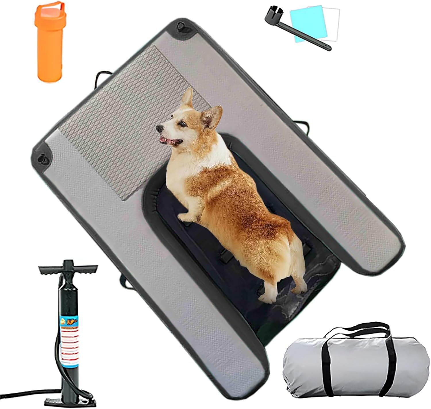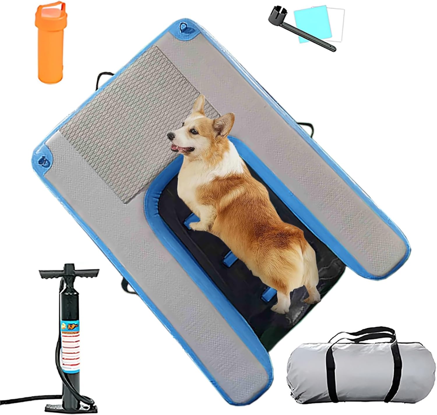 Engineered with the durable materials, this dog ladder is designed to endure and accommodate even the largest of dogsThis floating dog ramp allows your dog to get in and out of a boat, dock, or pool with ease.Versatile and adaptable to various water activities, it's perfect for poolside lounging, pontoon boat adventures, or dockside playExperience the joy of safe and easy water access for you and your dog, with the added convenience of having everything readily available whenever you need itMaterial: Polyvinyl Chloride (PVC)Color: Cyan , Blue , Black , Red , YellowSize: L 59 in, W 39.4 in, H 3.9 inProduct Weight: 17.6 lbsLoad Capacity: 230 lbsPackage Content: 1 x dog boat ramp1 x handy carry bag, 4 x ropes1 x hand pump1 x repair kitFeature:The dog pool platform is made of PVC, rigid when inflated, claw-resistant and punch-resistant, so that dogs can enter and exit with confidenceThe dog ramp is made of anti-leakage material to ensure stability and prevent rollingThe dog swim ramp surface has a concave convex texture design and an additional EVA anti-slip pad to provide good gripPool dog ramp mesh is firmly stitched and not easy to tearInflatable dog ladder built-in steps add increased traction underwaterFast Inflation Set up in minutesStorage-Friendly Easily packs awayComfortable platform for dogs of all sizesTips:Manual measurement products may have dimensions of a few centimeters of difference, please understandThere may be some differences between the image and the product due to display and lighting reasons, please refer to the actual product